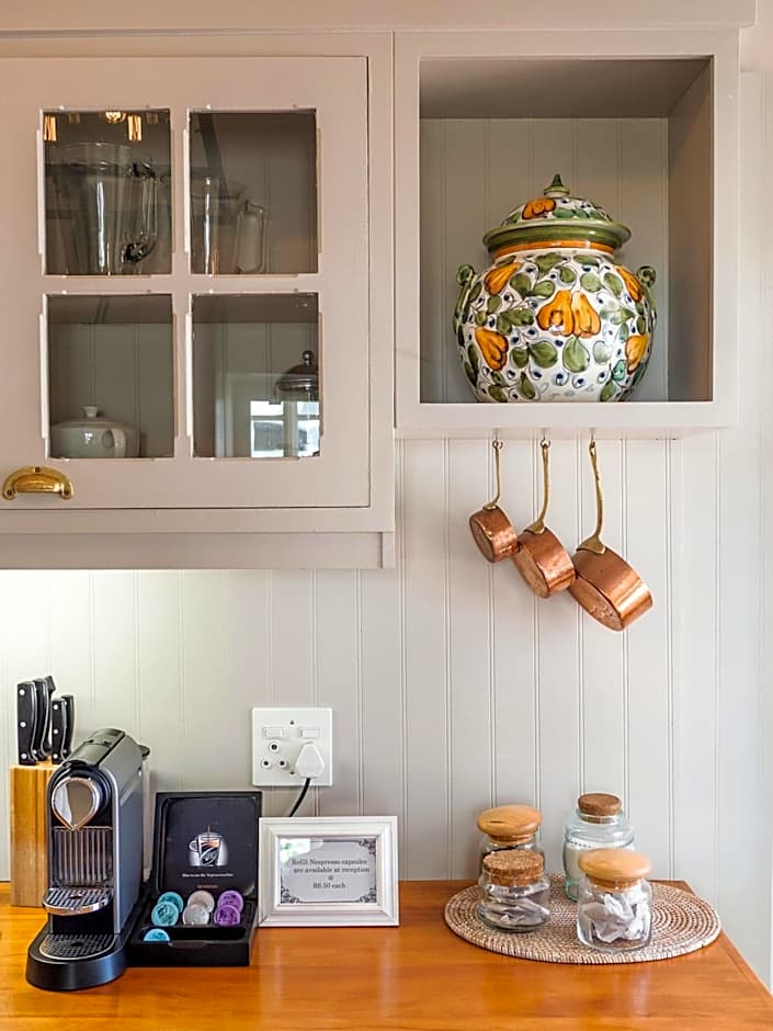 The spacious Honeymoon Suite opens onto a courtyard which overlooks vineyards with mountain backdrops. Decorated in hues of mountain blues and soft, earthy browns with white, the suite features air conditioning, underfloor heating, a ceiling fan and a mini bar. It includes a dressing table with a hairdryer, a Nespresso coffee machine, tea making facilities, and satellite TV