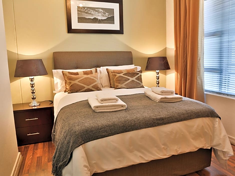 The apartment offers one queen-size and one double bed in 2 bedrooms with attached bathroom, as well as a lounge, dining room and fully furnished kitchen.