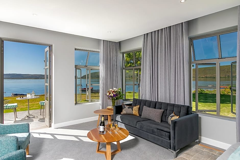 This suite features views of the Knysna Lagoon and includes a garden shower with deluxe bathroom amenities, a fireplace and private patio.