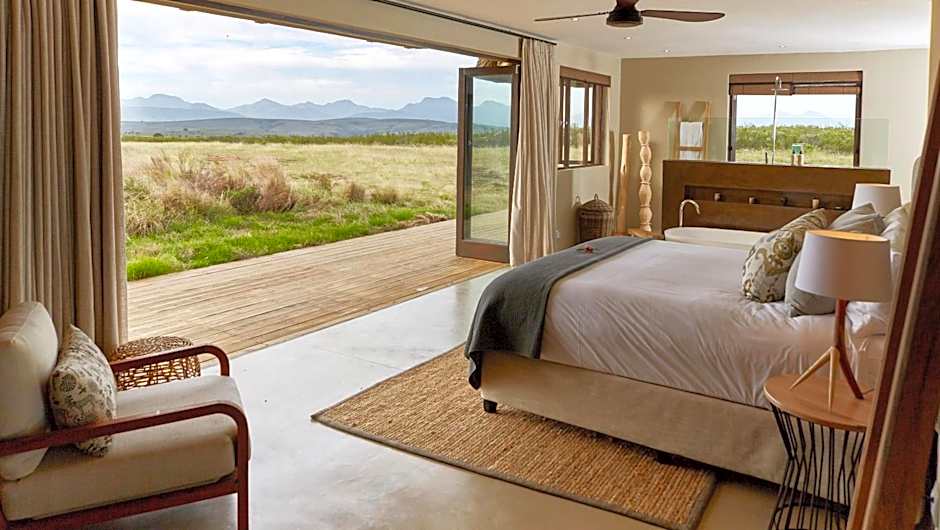 This Afro-chic villa is located next to the main lodge and has a thatch roof, an open plan lounge, and dining and kitchen area. The living room includes a fireplace and large doors open onto a large wooden deck offering panoramic views. The spacious bedrooms include furnished private decks and gas fireplaces. The bathrooms have deep baths, walk-in showers and twin basins. No kids under the age of 12 years old allowed in this room type
