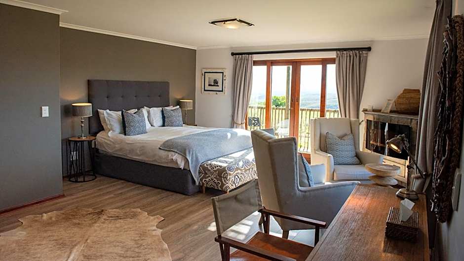 3 Bed Villa This Afro-chic villa features a double-volume thatch roof with an open-plan lounge, dining and kitchen area. The living room includes a fireplace and large doors open onto a large wooden deck offering panoramic views. The spacious bedrooms include furnished private decks and gas fireplaces. The bathrooms have deep baths, walk-in showers and twin basins. Please note, guests need to drive themselves to and from the main lodge for meals and game drives. 3.1 mi 15 minute drive.