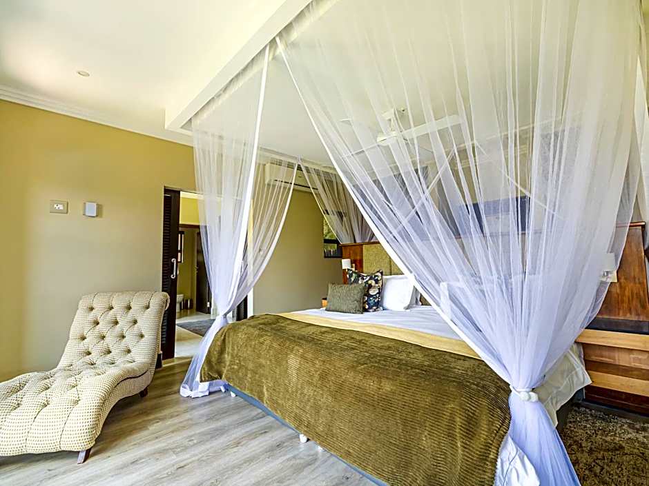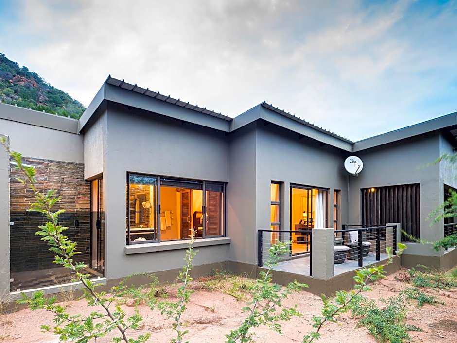 This suite offers an en-suite master bedroom with an en-suite indoor shower and double outdoor shower. Each suite has a lounge with a flat-screen TV with selected satellite channels. The lounge leads out onto a patio with view over the Pilanesberg Game Reserve.
