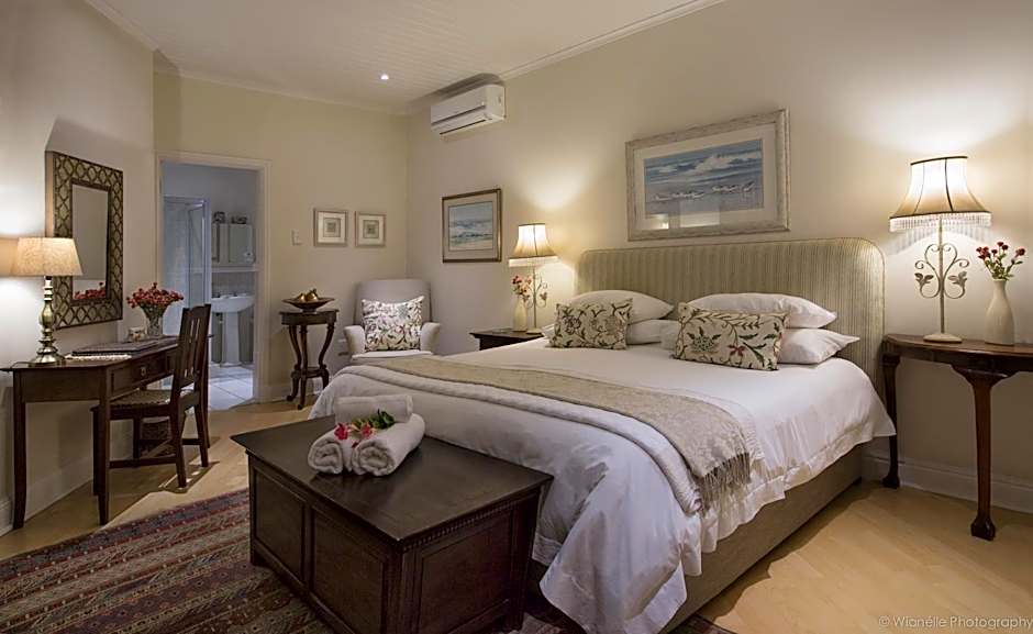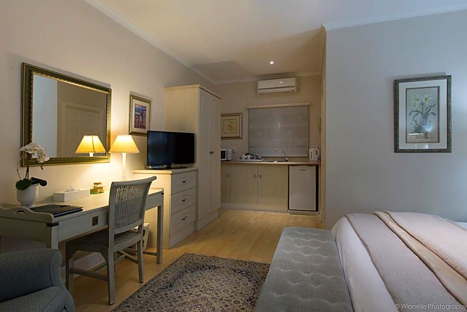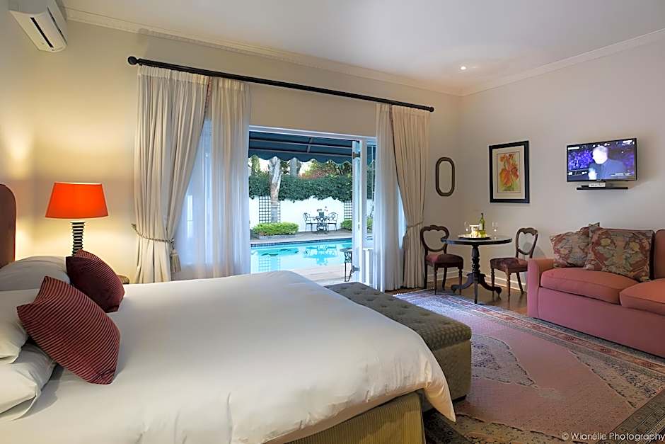This room is located at the far end of the pool and provides extra privacy. It has private access from the garden and opens onto a patio, with a lovely view of the pool. It is decorated with Beach Wood floors and ample cupboard space. HD television and complimentary uncapped WIFI.