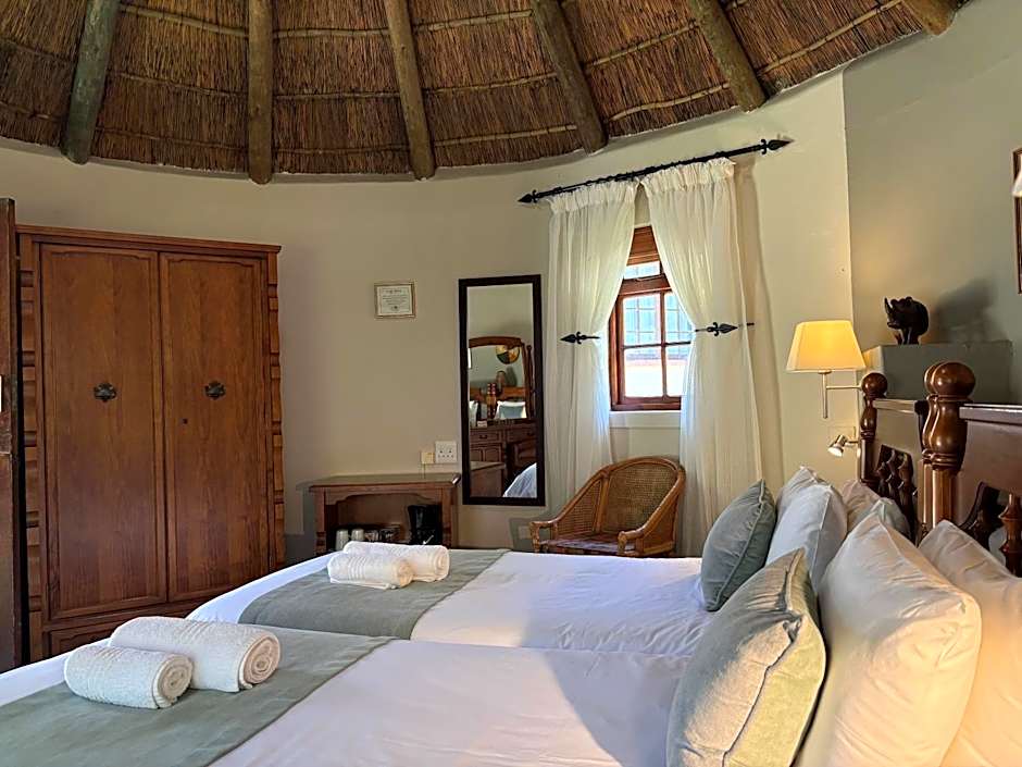 These thatched units overlook the swimming pool with views towards the surrounding hills, mountains and garden. They have and queen-size bed and a bathroom with shower over bath.