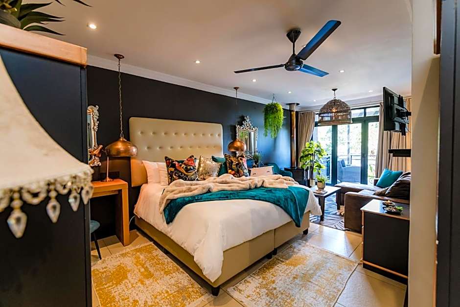 Inspired by the earth colors of Africa, this suite has an Italian marble bathroom with a double volume spa shower and twin basins. The patio overlooks the garden.