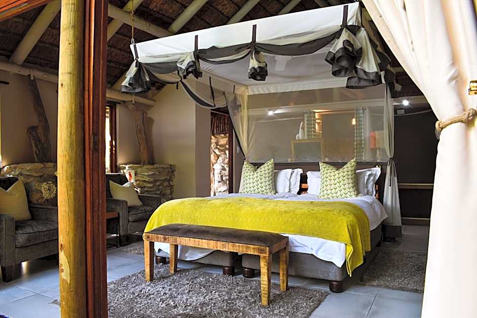 Featuring a private deck with mountain and lagoon views, this suite is built in a safari-style in an ancient milkwood grove. It includes stone walls, a thatched roof, and glass doors that open onto the the natural surroundings.