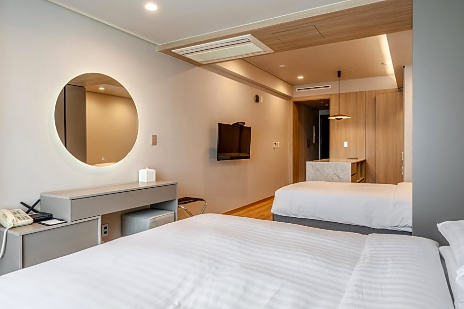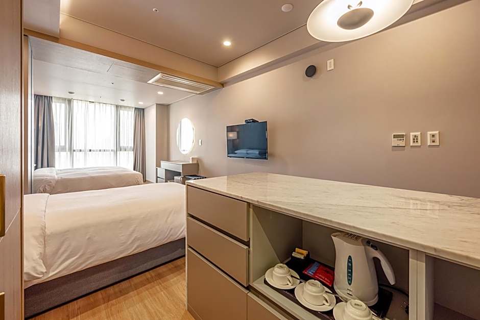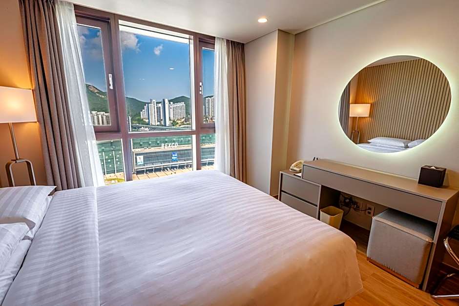 The location is excellent - It’s close to everything you may want or need. The nearest metro station (Centum City) is 5 mins walk. Centum City Mall - the world’s largest mall - is less than 10 mins walk. Homeplus (huge supermarket) is less than 10 mins walk. Haeundae beach is a few stops on the metro. BEXCO is opposite. There’s plenty of restaurants and cafes within walking distance. There’s a CU, GS25 (convenience stores) and Coffee Bean cafe all in the lobby of the hotel which was so helpful! The staff are generally all friendly and polite. The cleaning staff are very friendly! The room is pretty big and decent sized for a short vacation. Some kitchen facilities such as induction stove, sink and kettle.