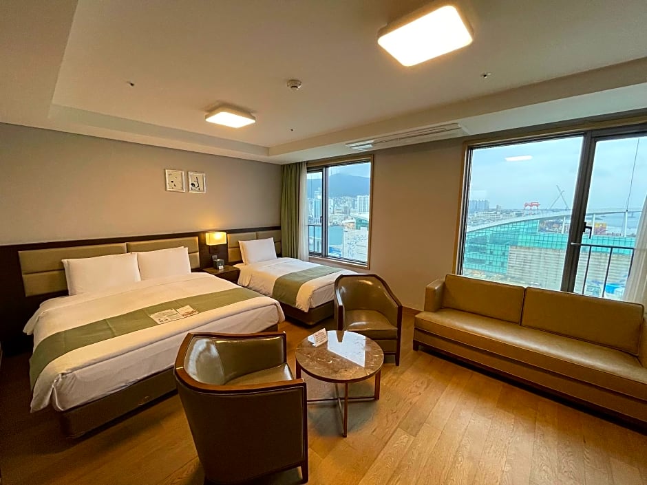 The twin room with ocean view provided a wonderful view over Jagalchi Fish Market and looking across to Namhang Bridge, both of which are lit up at night. The room was spacious and comfortable, with excellent lighting. I love the hard wood floors and the sitting area at the window. Clean and comfortable, and conveniently located between Nampo and Jagalchi subway stations. The staff at this hotel is absolutely lovely. Most speak functional to excellent English and all are extremely welcoming and helpful. Really love this hotel.