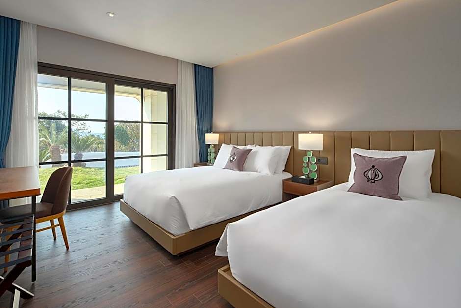 This suite has a balcony, sofa and air conditioning. You can enjoy the beautiful sea view of Udo Island in the Superior Suite with a modern interior.