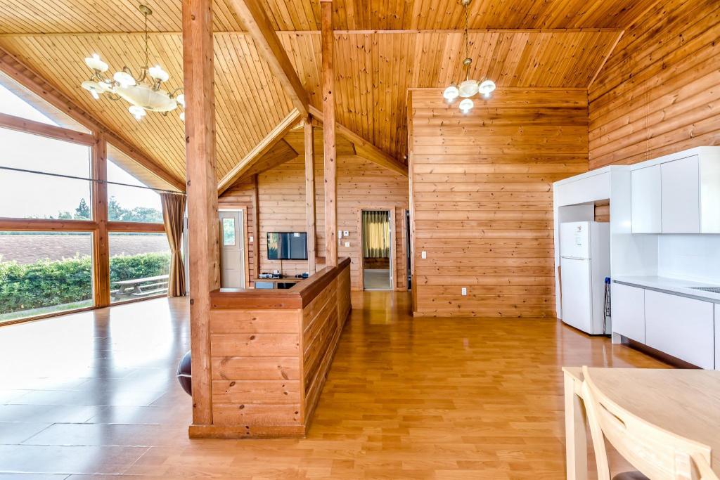 Big room with A LOT of space and balcony (beautiful sea view and surrounded by nature). Room had a kitchen and utensils. There’s a warm pool with nice views. Convenience store open till 22PM. 10min from the center Seogwipo.