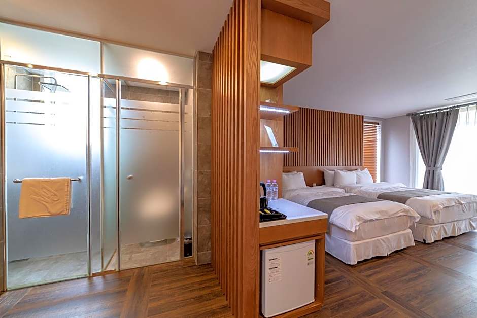 This resort truly exceeded our expectations. The room was spacious with a stunning sea view. From our window, we could even see the Haenyeo (female divers)’s huts — one of the best ways to experience Jeju Island is simply relaxing at this hotel: watching the ocean, playing by the beach, catching crabs, and observing the Haenyeo diving for sea urchins. It was incredibly relaxing. The hotel restaurant was also excellent — breakfast was simple and satisfying with a great view. The rooms were all very clean, with modern, spacious, and comfortable facilities. The staff were extremely warm and welcoming. We also appreciated the free laundry service. Sleeping here was very comfortable. Staff can speak Chinese and English
