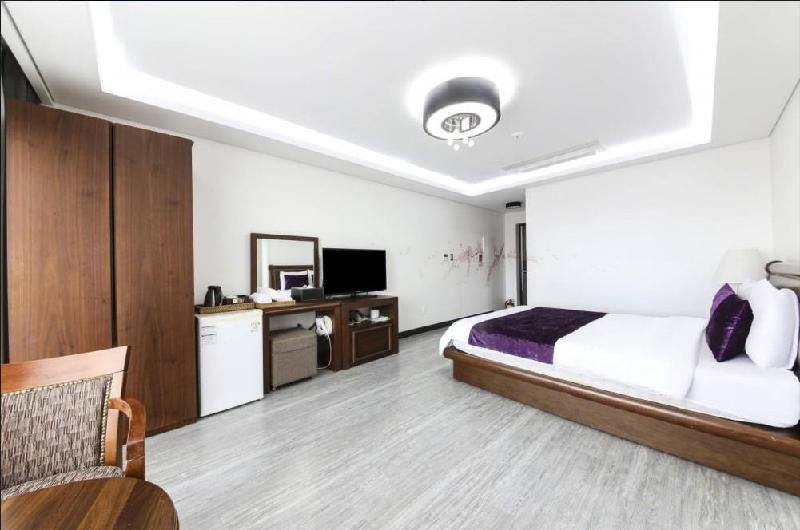 Address: 97-13 Beophwansang-Ro2beon-Gil (877 Beophwan-Dong, Seogwipo-Si). Amenities include free parking, a free outdoor swimming pool, free Wifi, air conditioning, non-smoking rooms, a bidet, and upper floors accessible by elevator.