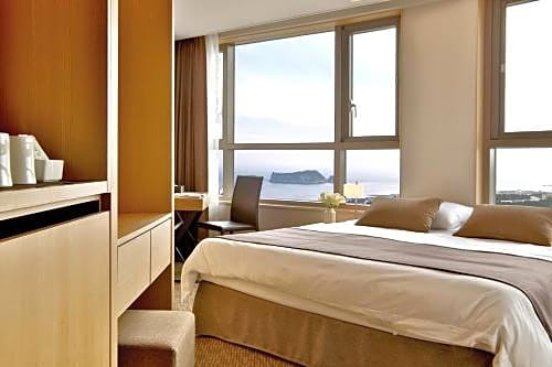 Featuring sea views through its panoramic windows, this modern room is finished with carpet flooring and a seating area with a coffee table. Private bathroom includes a walk-in shower and free bath amenities.