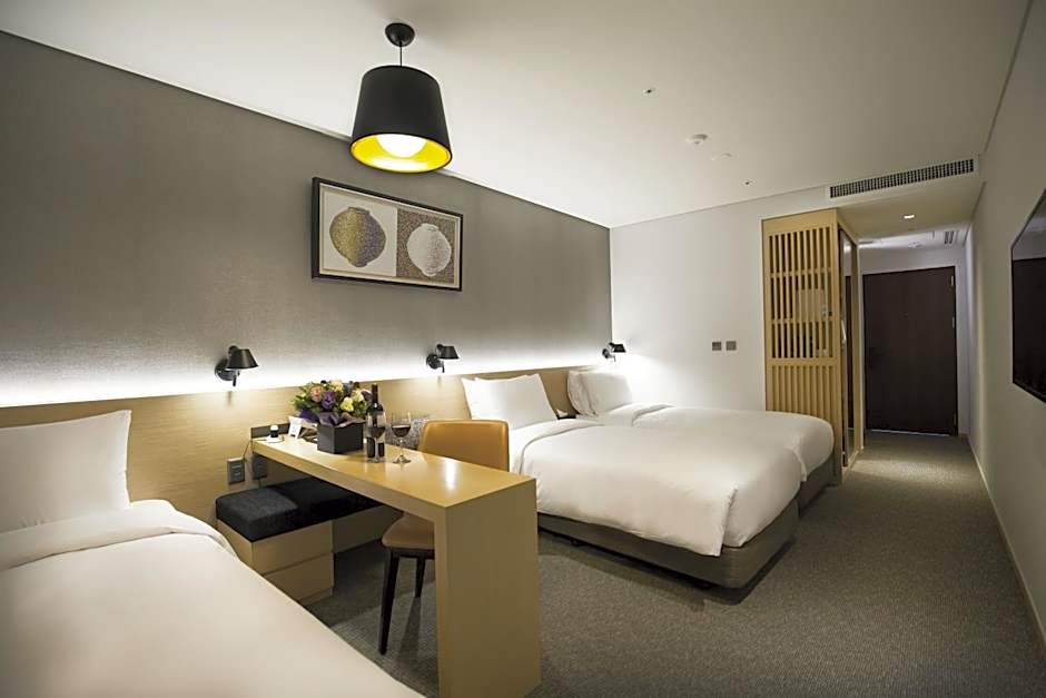 We stayed in two rooms for six days. The rooms, towels, and bedsheets were clean, and the cleaning service was excellent! Even when we left the room at 2 or 3 p.m., it was still cleaned. The rooms were exactly as in the photo: big, clean, and bright, with a great view. The rooms had many storage spaces, a safe, a teapot, an iron and an ironing board (by request), bathrobes, shampoo, hair conditioner, body wash, and body lotion. The breakfast was great. You have a variety of meals: omelets, fried eggs, sausages, croissants, fresh salad, dumplings, holland waffles, toast bread, jam, butter, good coffee, and black tea (rare in Korea). The hotel's location was perfect. It has a cafe with coffee and desserts, a convenience store, an ATM, and many restaurants and shops nearby. The bus and metro stations were also close.