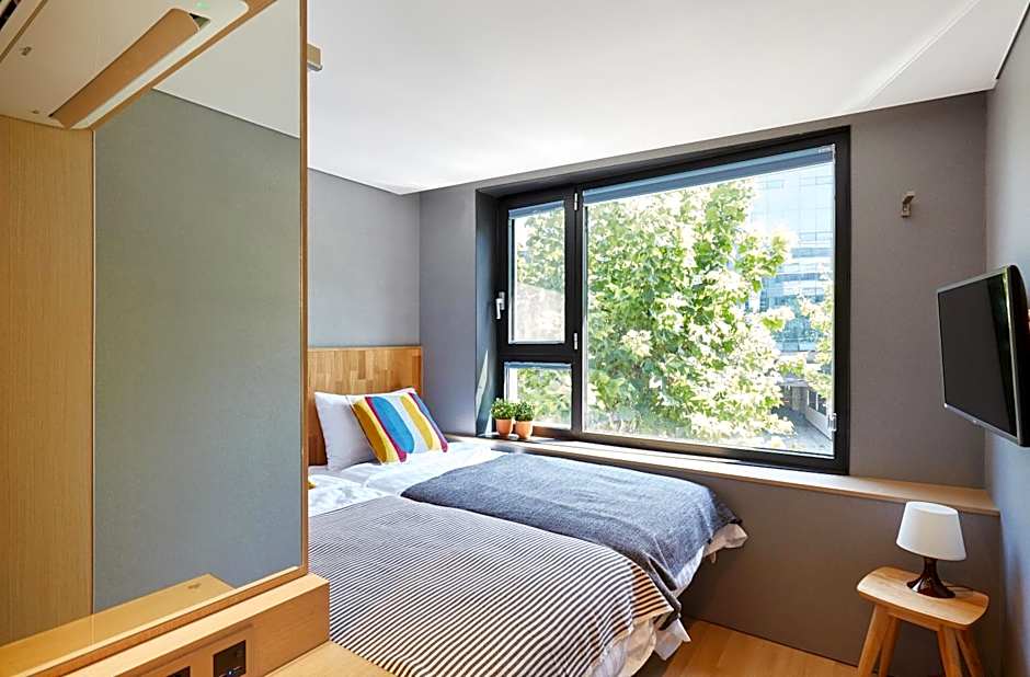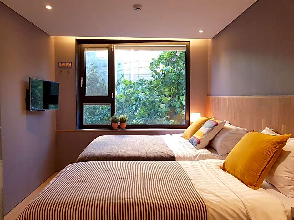 Great room, small but comfortable and had everything we needed. Beds were comfortable, room was super clean and The location is AMAZING. They have a back door that opens onto a series of streets filled with places to eat. We were spoilt for choice whenever we stepped out for cafes, restaurants and boutique shops. The proximity to Hongdae’s various theme streets is also great to explore.