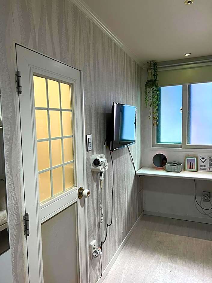 The LOCATION. Was sooo close to almost ALL the places I wanted to go. The stations was a good 2-3 minutes walk .Bus stops are close as well. Area was laid back but very comfortable with convenience stores around. There's a Daiso 10 min walk away for essentials, a folk flea market nearby .A very convenient train station green ,ue and briwn line that will connect different ways.For the 5th time, It was by far the best place I've ever stayed in Seoul. The hostel is an old building so it is expected to have wear and tear. good enough for the price I've paid. It is however complete with all a traveler needs like iron, hairdryer, kitchenette, with coffee ,jam.and bread, tho lasted.only 2 days,but still better than nothing.they only refill bread once a week😁😘. Fridge . Thye also provided with shower towels and BEST PART- Feet towels . Love this so much as I dont like walking in wet feet after shower. There is a box of wet wipes in the kitchen to use in wiping the table, again a PLUS for me. With all its Imperfection still loved staying here. And will.come.back 100%
