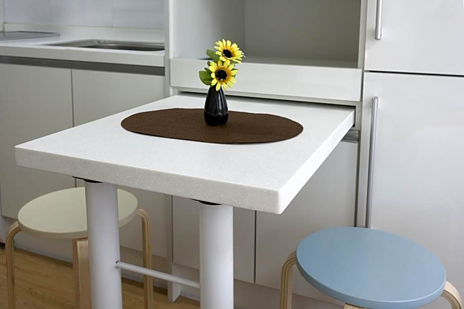 The pictures are a little outdated. Unlike in the pictures the stove is covered due to safety reasons, so you can't use it... The microwave is located outside the room in the hallway for the whole floor to use which is quite normal for korean hotels. There is no kitchen or sliverware other than two cups and the waterheater. ... If you need to dry your laudery you have to ask for a drying rack at the front desk.