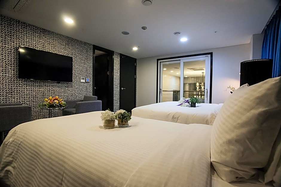 This room was great. It had a lot of table/counter space so we fit well. There was plenty of room to still move around once our suitcases were opened. Bathroom was big. Everything was clean and the staff that refreshed our room was very polite about our stuff. The location is awesome, it's in a really fun little district full of bars, restaurants and little bit of shopping. If you're not an adventurous American, you have a Starbucks and McDonalds on the same square. Convenience stores are peppered all around so anything you might have left at home can be purchased. There's also a bank that converts money right around the corner. The walk to the subway was about 8 minutes, and it's a main line (inner line) so you can easily get to anywhere you want quickly. The art is really cool and there's a lot to explore. The main tourist spots are 30-45 min away by subway and that's mostly because of spurts of walking (I'm fat and slow) and waiting on trains for transfers (usually 1-3 minutes). Communication with the staff both at the hotel and prior and after was fantastic. There was a gentleman that was fluent in English but the main lady that we ran into manning the Desk only spoke a little English but with the help of translation apps we had zero issue. I only mention this because it's important that English speak people understand that you need to learn Korean more than you think, don't be a rude American and expect everyone to cater to you!!
