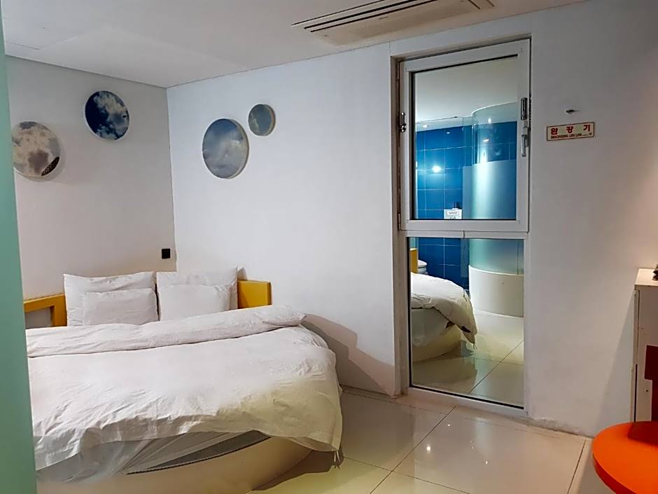 The hotel im sure serves its purpose for the locals as a hookup hotel, the first thing that caught me off guard was that the rooms are basically nothing like what they look like in the pictures and are not clean, multiple hairs lying around, lots of stains, and every room has a very different layout depending on the theme of it. There was also an ad for a traditional chinese massage in the room, which obviously is for a service that would end in a little more than a massage. I was traveling to Seoul as a tourist so the purpose of this hotel was defiantly not for me. The reason we had booked here was really just because the location looks good as its close to the Metro station connecting the orange and blue lines. We were also cat fished by the pictures that the property has posted of their rooms, as most of the rooms do not look like the ones in the pictures. I was in the "Modern" themed room and it was really just a plain white room with a bathtub right next to your bed, really strange as this means its impossible to clean up without soaking your bed.
