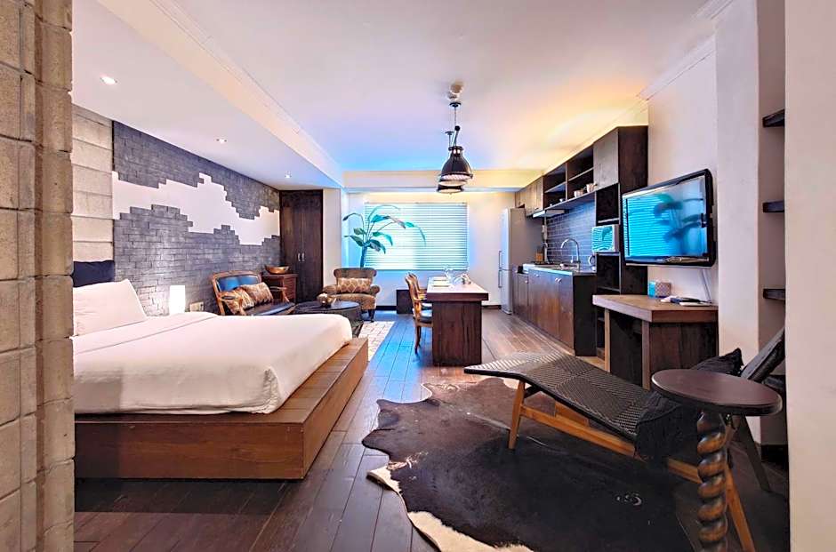 Spacious and chic, this loft-style suite can sleep a family of 4. Featuring tall ceilings and concrete heated flooring, there is a fully equipped kitchen and a sofa on the first floor. Beds are on the second floor.