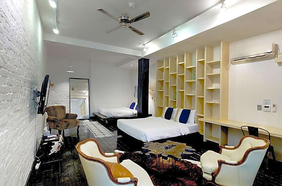 Uniquely designed, spacious air-conditioned suite features high ceilings and heated concrete/hardwood flooring. Comes with full kitchen facilities and a modern living room. Private bathroom has a shower.