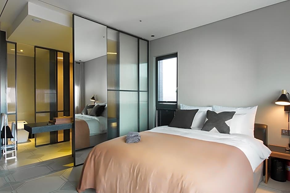 Location was great. Plenty of shops and eating options. Korean BBQ, Frank Burgers across the road amazing. Breakfast at hotel is basic but $13 aud. No cappuccinos though or buffet. I would have liked more choices of breakfast food. Rooms were all different decor, I really liked the ones I saw as my sister stayed as well. Spacious, a lot with marble, wooden, large oval bathtubs. Bed comfortable, pillows awful, toilet the automatic state of the art, 2 bottles of water daily but you could get more in a down stairs fridge. Washing and dryer machines available along with a microwave and free tea and coffee. Hotel is boutique size. You have to pay extra to use the pool which I didn't realise until we were told. Its $32 aud per day. Has a spa. Usually pool use is included in room price but SRs is optional addition. Has a restaurant which I didn't use. Small lounge area. TV has a few English speaking channels on. I would have liked Netflix included. Has built in international power points which was great for phone charging without an adaptor. Two nice bathrobes in room CONS no English speaking receptionist CONS No wardrobe just coathangers off a wall that I could barely reach , no shelving in my particular room. Other rooms I think had more storage . The price was good for South Korea though for the location. I do recommend.