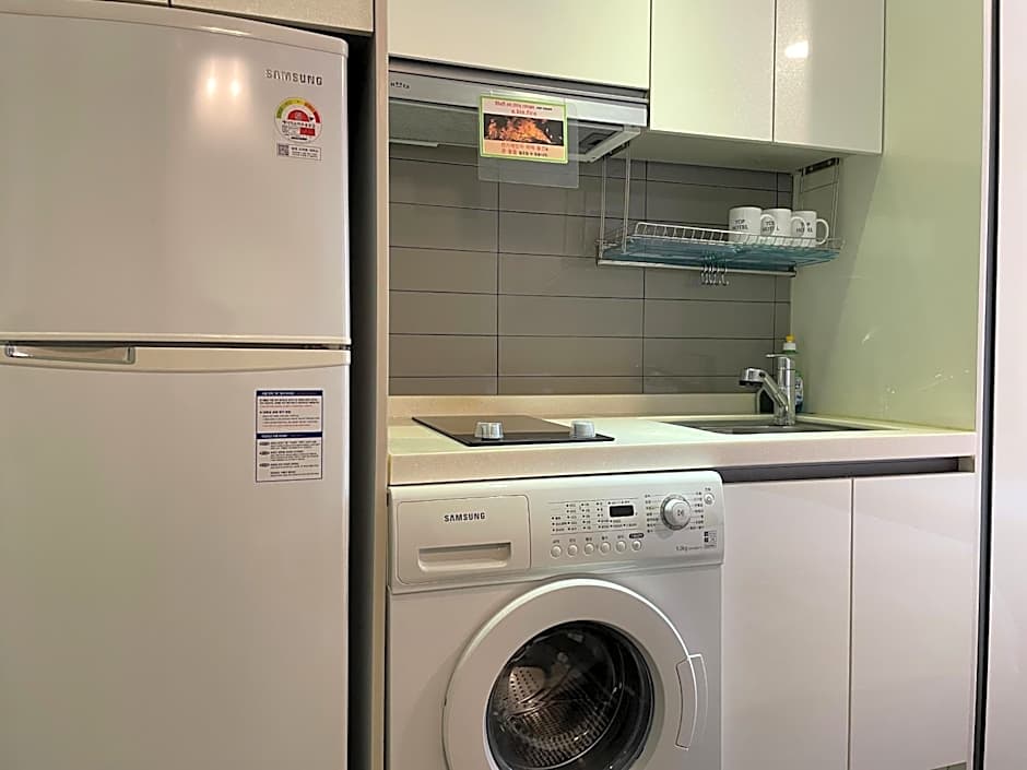The facilities were great (full fridge, washing machine and a shower that is good for tall people). The location is perfect if you are doing things around Seoul or meeting tour groups because the station has 3 lines that connect. There is easy access to water bottles, towels and toilet paper at the front desk and they will organise a taxi to get back to the airport. Manager was really friendly and accomadating.