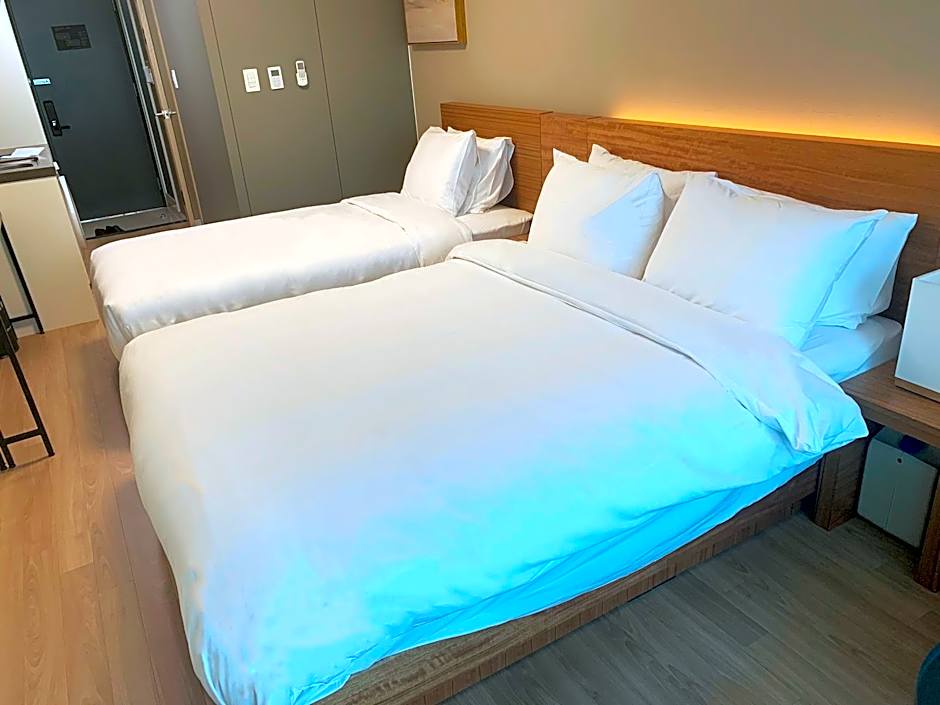 Staff was friendly and helpful. Location was good with many restaurants within walking distance and an eMart next door! Beds were firm and comfortable. Design was functional and clever and made use of every available space in the room.