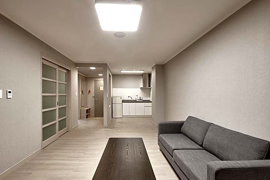 Location 6 km from terminal express bus, we can take there by taxi approximatle 9000-10.000 won. Big room ,warm, all kitchen amenities ready to use , rice cooker also. I love the smell of body wash so fresh. Comfortable bed. The room I choose fit for 5 people (2 bed room)