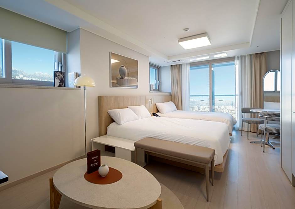 As you step into UH FLAT The SOKCHO, you’ll be greeted with a delightful fusion of modern comforts and traditional Korean aesthetics that make your stay memorable. Picture yourself unwinding in one of their exquisite studio apartments, where cozy interiors blend harmoniously with stunning city and ocean views. Whether you choose the Studio with Ocean View for a morning coffee while gazing at the waves or the Royal Studio offering additional spaciousness, you’ll find it perfectly suited to your needs as a traveler. With space for up to four adults in select family apartments, it's an ideal spot for friends or family to share quality time together.