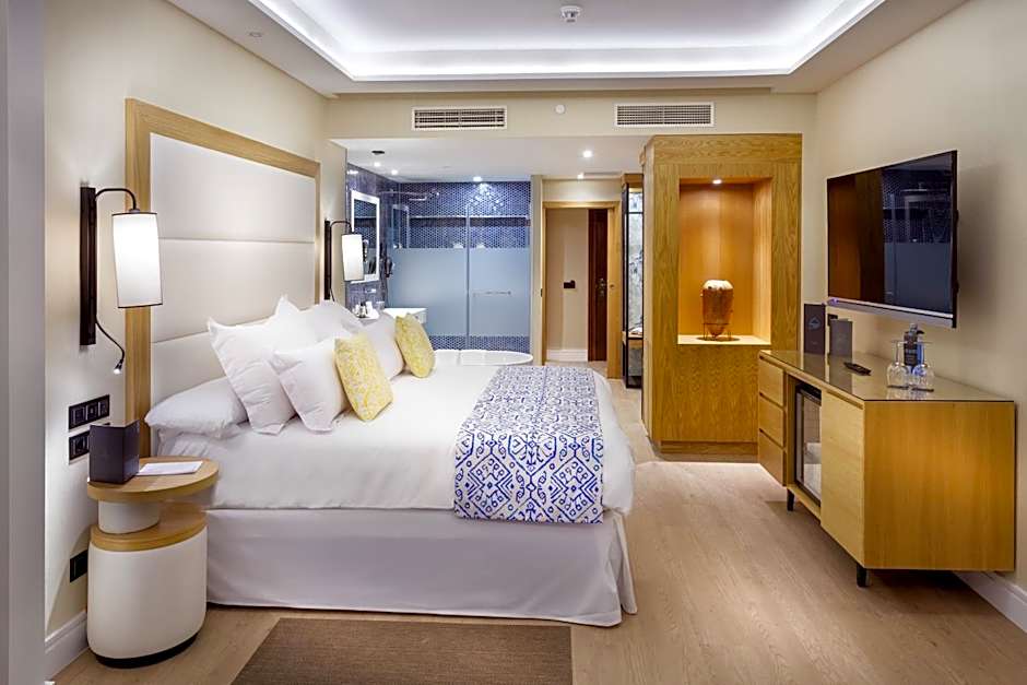 This spacious room features stylish Canarian design and a fully furnished terrace with private Swim Up pool. It includes a bedroom with additional sofa bed and original Canarian paintings. The open plan bathroom comes with jet-massage shower, freestanding bath and luxury amenities. Guests will find an open wardrobe in the room.This room also includes 55” Smart TV, unlimited Wi-Fi, safe, mini-bar, bathroom amenities, professional hairdryer, bath robe and slippers, HDMI connector HDMI, twin USB port, Bluetooth speaker and ironing center.