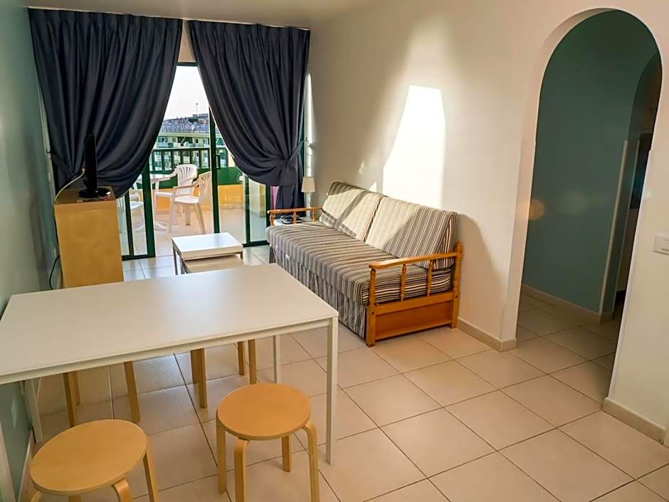 This apartment has 1 bedroom with 2 single beds and a fitter wardrobe. There is a living-dining room with a sofa bed, a bathroom with bath and an open-plan kitchen with ceramic hob, fridge, microwave, kettle and toaster. The terrace has outdoor furniture and pool views. The apartment also comes with a safe and a TV at no extra charge although a refundable deposit might be required.