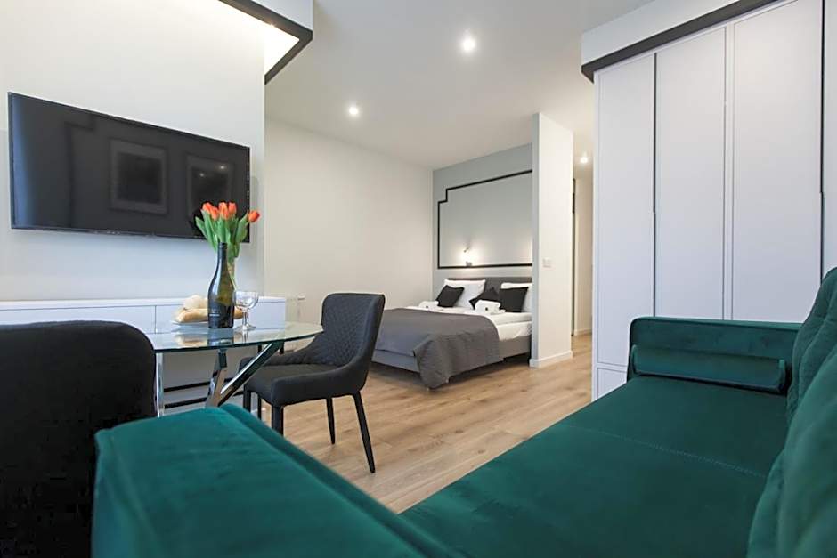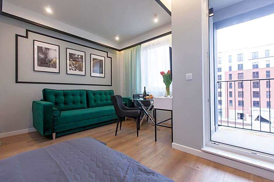 This studio is decorated with pastel colors and wooden furnishings. It features a balcony or a terrace, a TV and a kitchenette with an electric oven, ceramic hob and fridge.