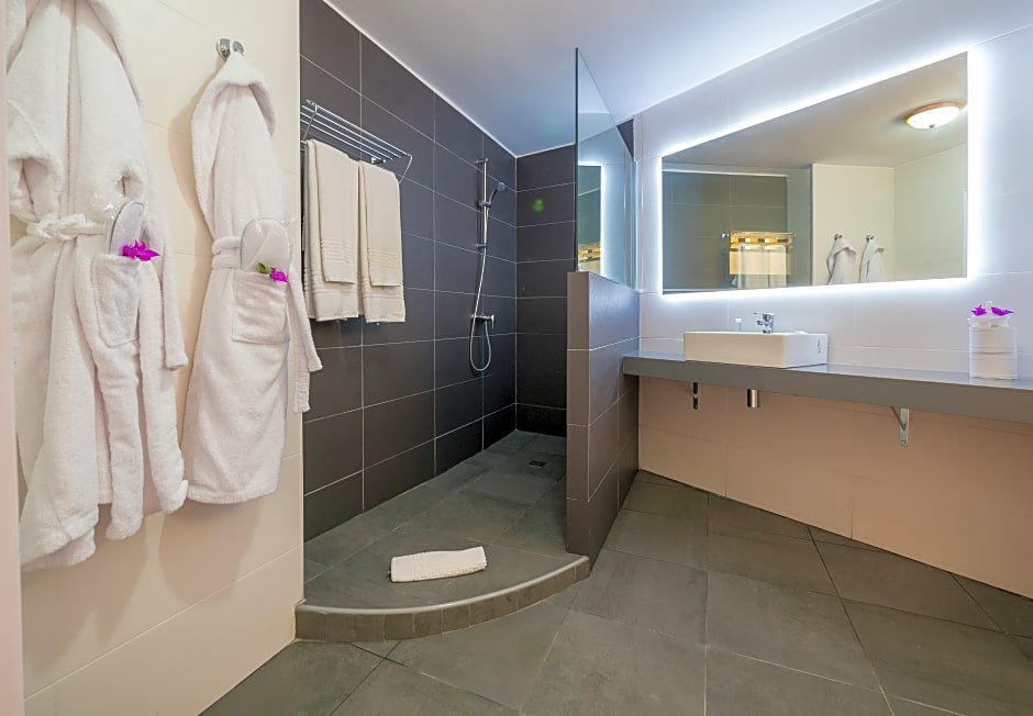 Premier apartments had a very large balcony with table, chairs and sun loungers Leisure facilities were included, squash, gym, tennis, crazy golf, table tennis. Cotton dressing gowns and slippers provided. Entertainment every evening. Good position, near the front, short walk to the beach, main bus stops,, shops and restaurants. Quiet area. 3 swimming pools, 2 heated..,(we went Jan to Feb) Reception staff very helpful. Well maintained complex. Large TV but the Internet was a bit ropey at times.
