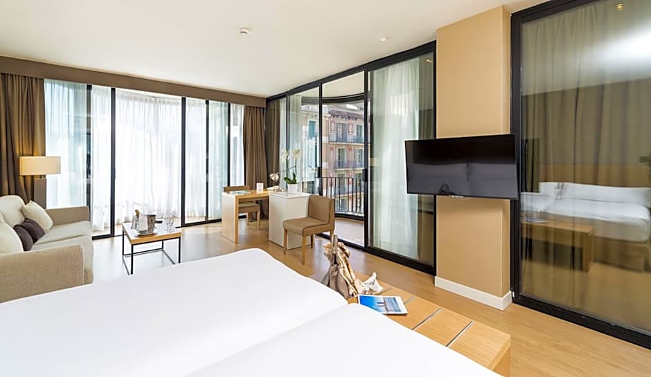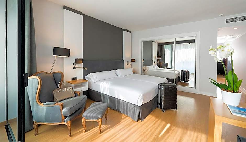 We travelled as a family with a young kid and a baby, the rooms were so big that we were even comfortable with navigating the baby stroller. It was a room with a bedroom, a connected room with a sofa that can be converted into 2 beds (I believe), 1 toilet and 1 bathroom. The staff was very helpful, the hotel was generally well run and in a very nice area with lots of local cafes, tapas bars etc. The internet was fast in my experience. There are supermarkets in 2 min.