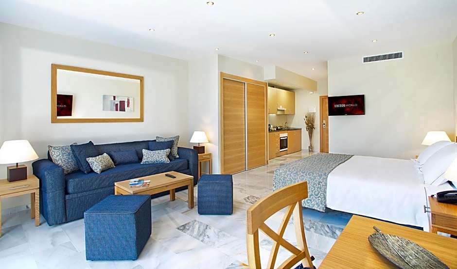 This studio features twin beds, living room with satellite TV, dining area and a fully equipped kitchenette with fridge, oven, microwave, kettle, toaster and coffee machine. The bathroom includes a hair dryer. Some studios feature a terrace while others include a window. All units feature sea view.
