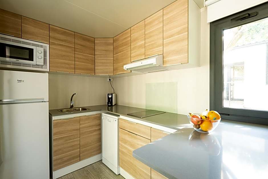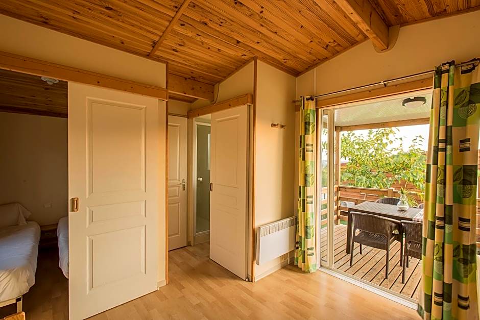Wooden bungalow with a double bedroom, well-equipped kitchenette, dining area and living room with flat-screen TV. There is a private bathroom and a furnished terrace.