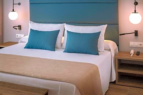 Hotel Mar Blau offers a variety of rooms including Family Suites accommodating 4 adults and 2 children, Triple Rooms with pool views for 2 adults and 1 child or 3 adults, and Standard Double or Twin Rooms with or without pool views for 2 adults. All rooms are non-smoking and feature a combination of double and twin beds. Room sizes range from 172 sqft to 248 sqft.