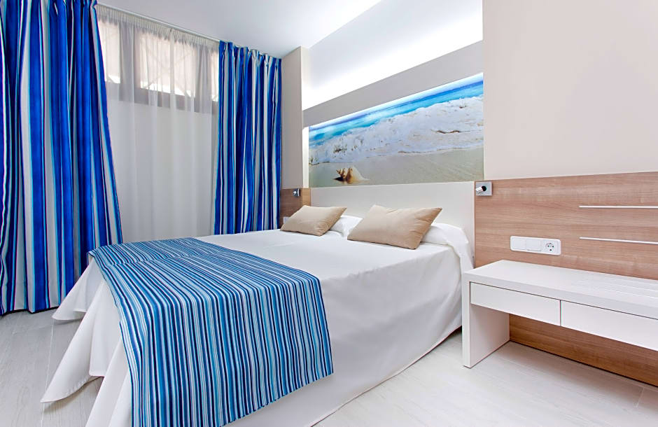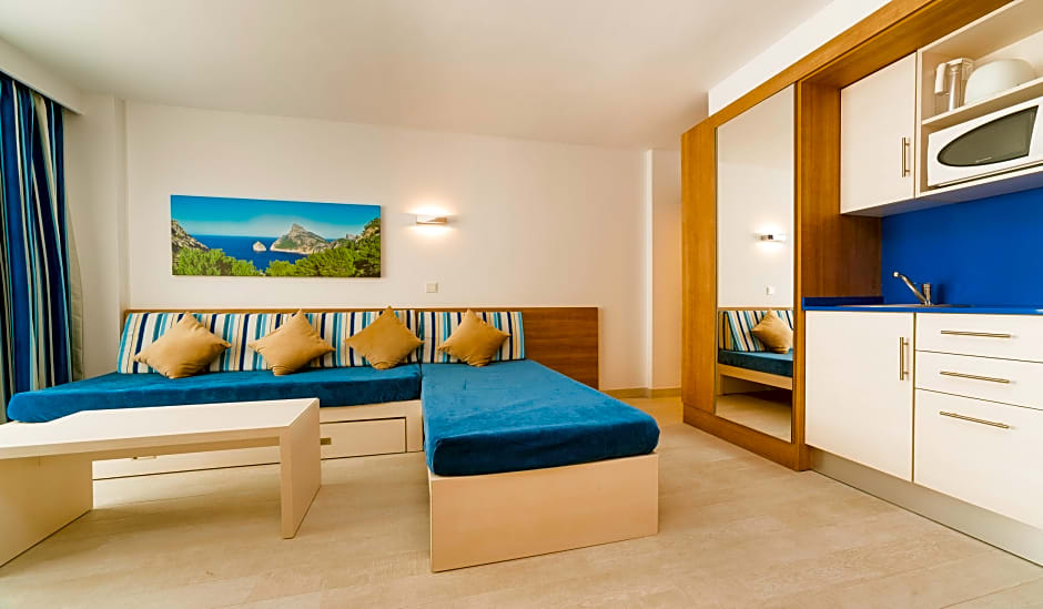 Initially didn't have the sea view apartment and were given a room on Level 3. Reception is on Level 4. AnyLevel below 6 at the back, doesn't even have a street view. It has a view of a massive 70 foot wall. The beds had the cheapest mattresses and were actually painful to sleep on. So we upgraded for €25 a night to sea view apt where the mattresses were much better too. Football supporters frequent Santa Ponsa and they left bottles of Buckfast, empty lager cans and cigarette butts all round the sun loungers, and sang loudly and drunkenly at night outside on the street.