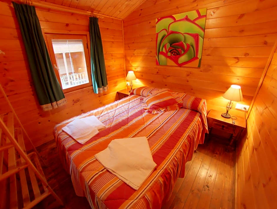This bungalow has a double or twin bedroom, and a seating area with a sofa, TV, microwave and fridge.