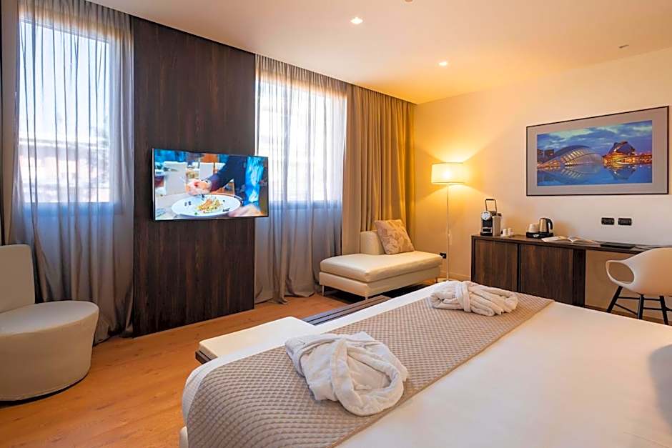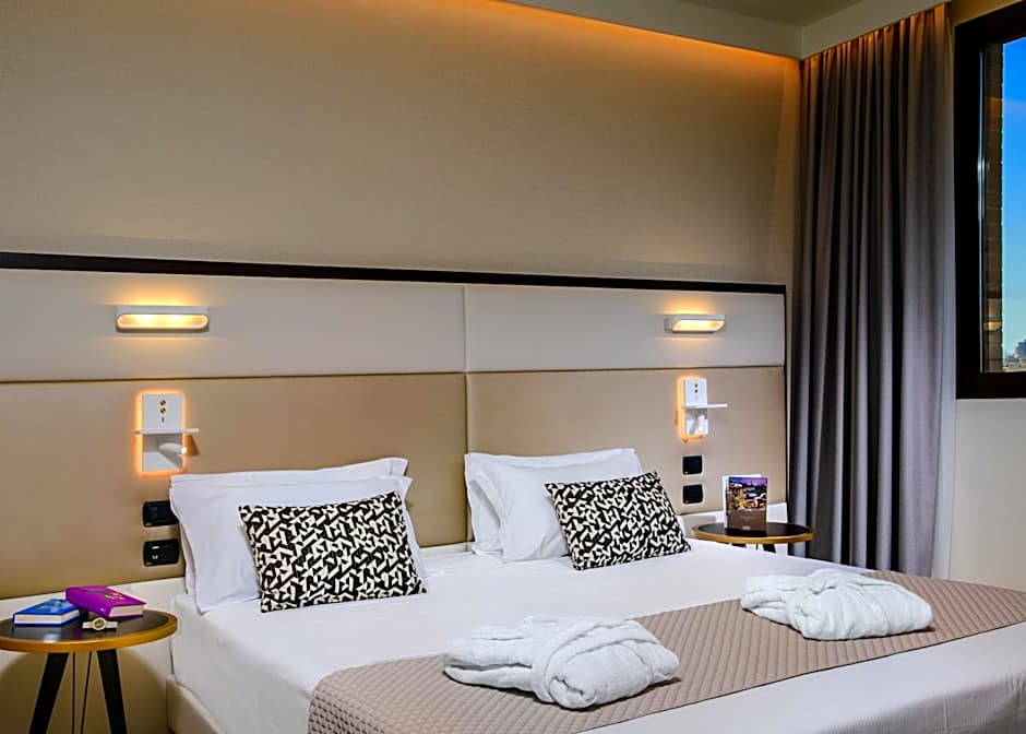 The Premium double room with its 28m2 and 7m2 of balcony, is specially designed for guests looking for more comfort, convenience and exclusivity. It has a capacity for 2 people in separate beds of 2x1m, with the possibility of transforming it into a double bed of 2x2m. It has a large bathroom with two sinks, separate toilet, hairdryer, amenities..