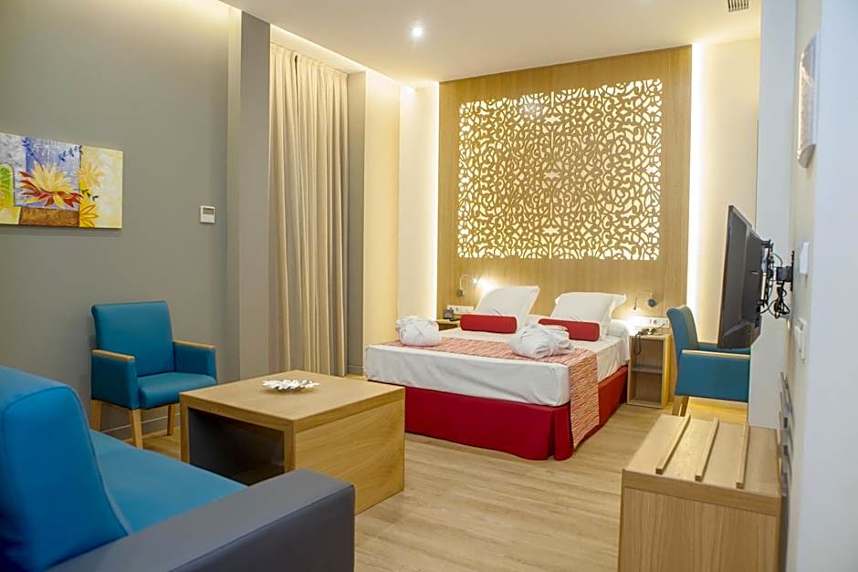 The hotel offers several types of rooms including Double or Twin Rooms with a queen size bed and twin beds, Comfort Triple Rooms with a double bed and twin bed, Suites with a king size bed, Family Rooms with a double bed and sofa bed, and Deluxe Double Rooms with a queen size bed. The rooms do not allow smoking and can accommodate varying numbers of adults and children. The sizes of the rooms range from 194 sqft to 463 sqft.
