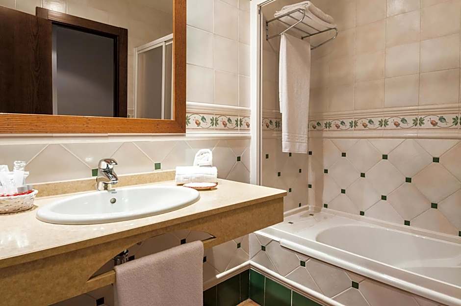 The spacious twin/double room features air conditioning, a wardrobe, a balcony with pool views as well as a private bathroom boasting a bath.