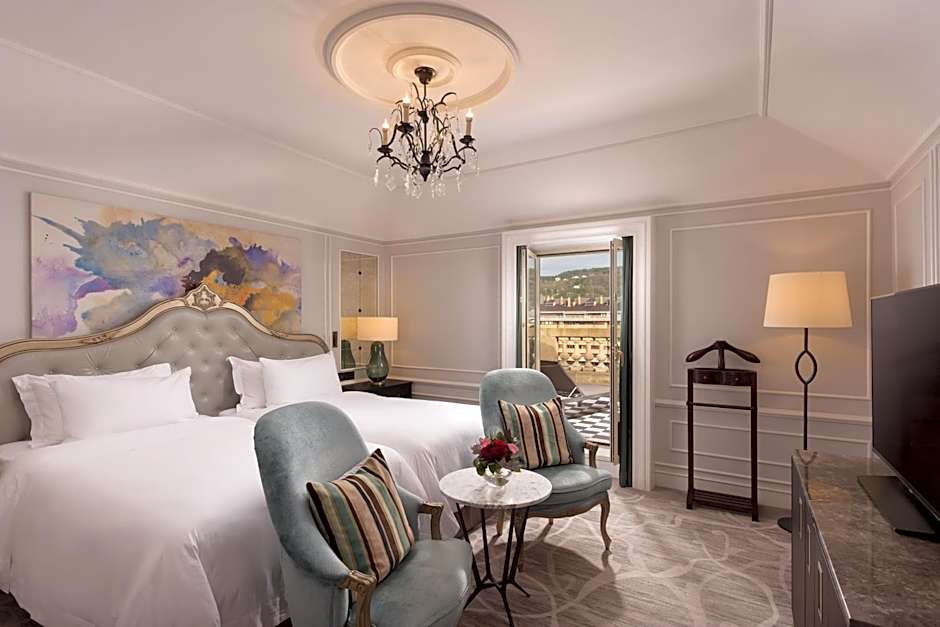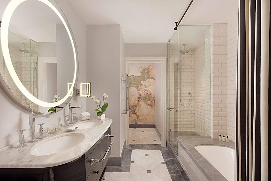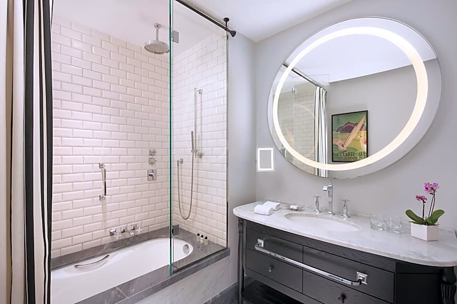 Featuring a private, furnished terrace, this suite includes a living room and a separate bedroom, both with a 48-inch flat-screen TV. The modern décor is combined with Belle Époque elements such as ornate marble fireplaces, and artful black and white photographs. The bathroom includes a rain-effect shower, 2 sinks, bathrobes and slippers.