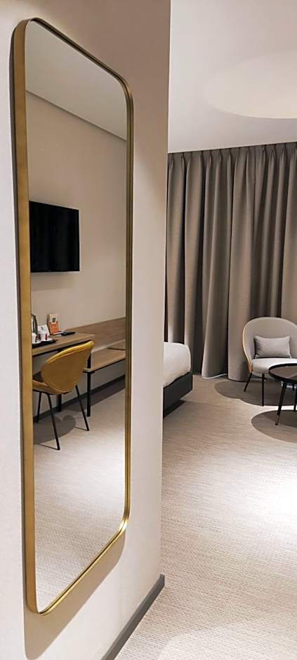 The Standard rooms are spacious, fully soundproofed, exterior rooms decorated in a modern style with warm colors that invite you to rest. They have a queen-size bed measuring 5.2 ft x 6.6 ft or two twins measuring 3.4 ft x 6.6 ft each, depending on your choice. They are equipped with duvets and the finest linens. They have floating laminate flooring, a large work desk, mini-bar, safe, telephone, flat-screen LCD TV and full bathroom. located only on the first floor.