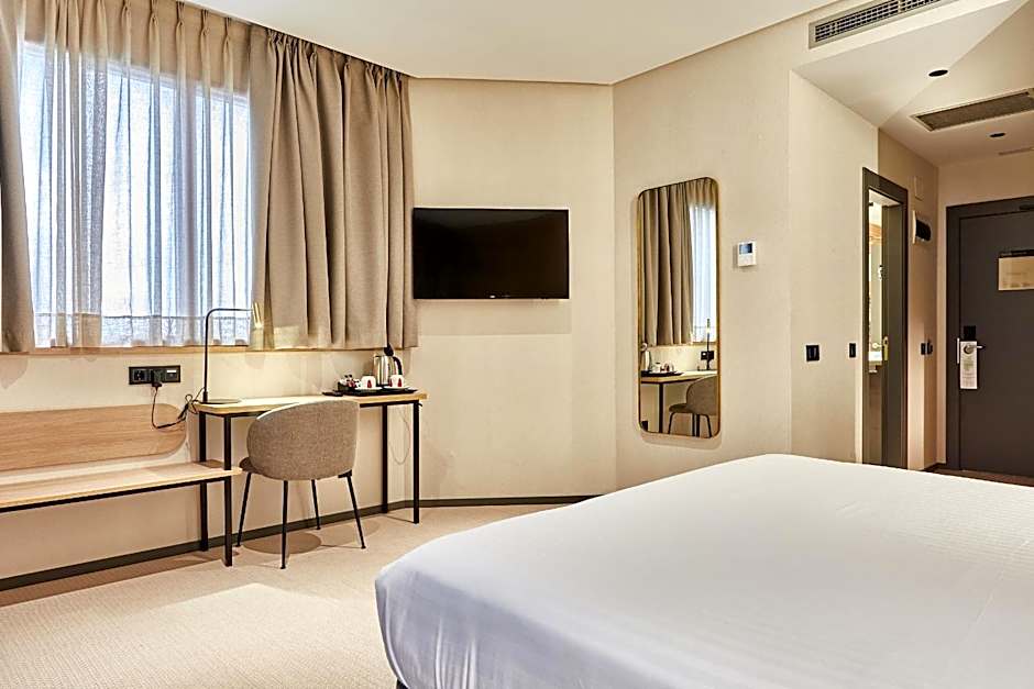 The Standard Deluxe rooms are exterior rooms, recently renovated, that offer a lot of space and extra comfort. They are located on the fifth floor of the establishment, thus enjoying a privileged location for those who wish to stay on a high floor. These double rooms have all the necessary elements both for a good rest and for developing a working day. They have a queen-size bed (1.80 x 6.6 ft) or two twin (1.05 x 6.6 ft), desk, USB and USB-C charging point, mini-bar, safe, telephone, TV and Full bathroom, equipped with a modern rain-effect shower to relax to the fullest. Thanks to our Deluxe service you can enjoy late check-out or early check-in subject to availability, as well as a coffee set in the room.