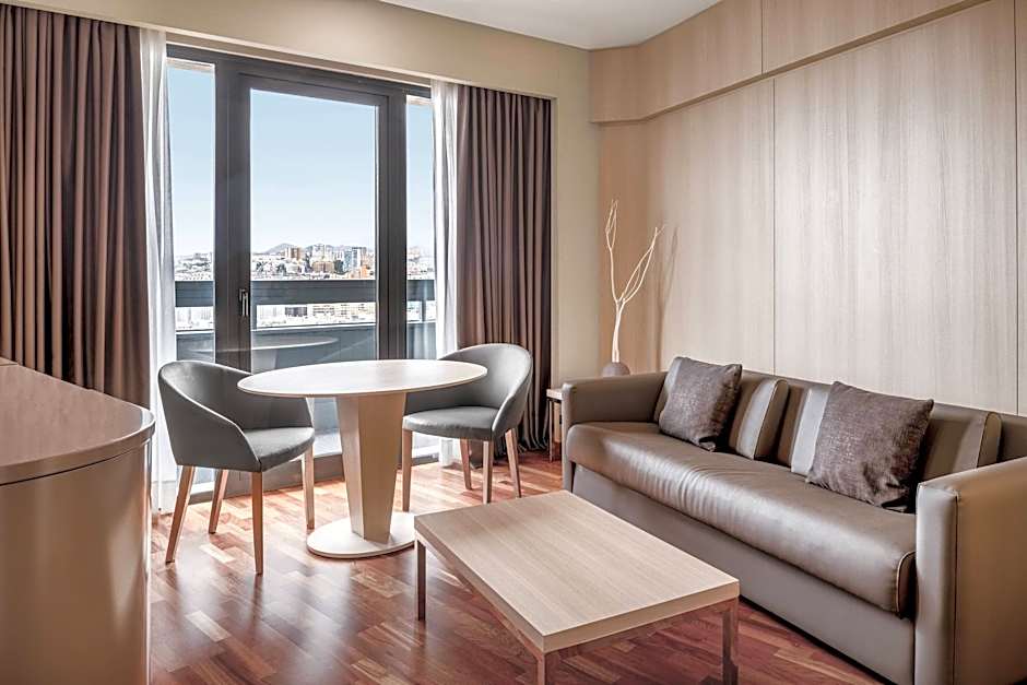 This spacious, air-conditioned suite features wooden flooring and modern design. There is a seating area with a sofa, plasma TV and a mini-bar, as well as a private balcony with city views. The bedroom features 4 different pillows and a plasma TV with more than 20 channels. The private bathroom includes a professional-level hairdryer, bathrobe and slippers. There is also a Nespresso coffee maker.