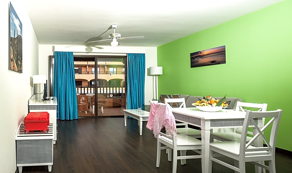 Spotlessly clean complex with very helpful staff and very large appartments with lots of extra facilities as in tennis courts , splash area for children , showers and luggage room for check out for late flights, gym etc . Lovely pool but needs a lot of sun to heat it up ! Central enough if you don't mind a 15 minute walk to Cristionos beach and main restaurants but there are quite a few restaurants closer if suits . Cleaning service for appartments excellent with loads of clean towels.