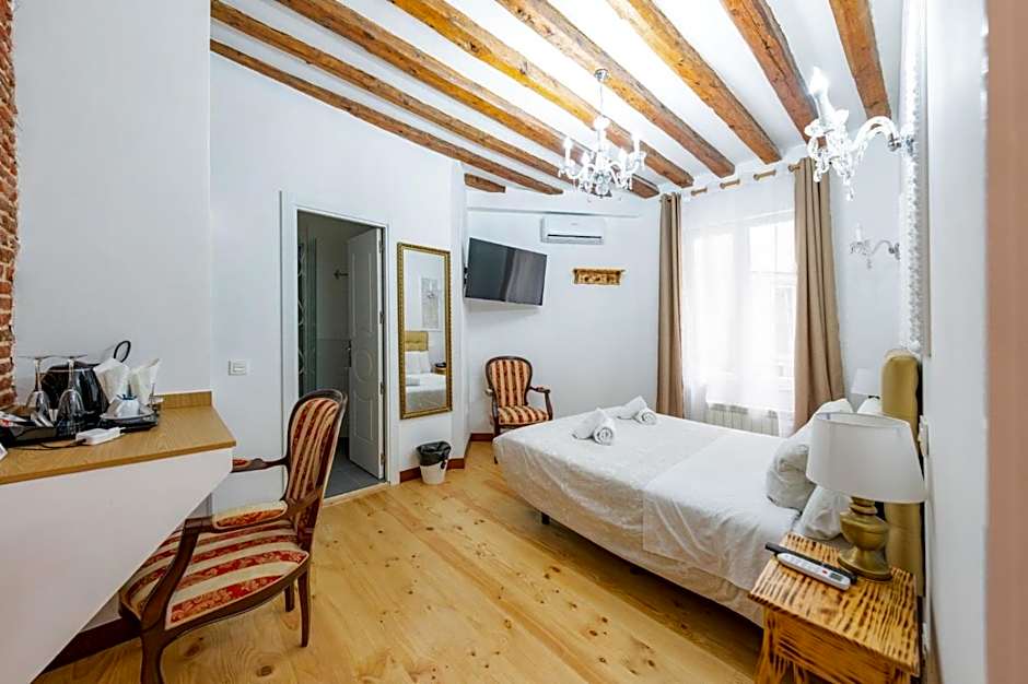 This room features parquet floors and a private balcony with views of the city. There is 1 large double bed, 1 bathroom with a shower, and a separate seating area.