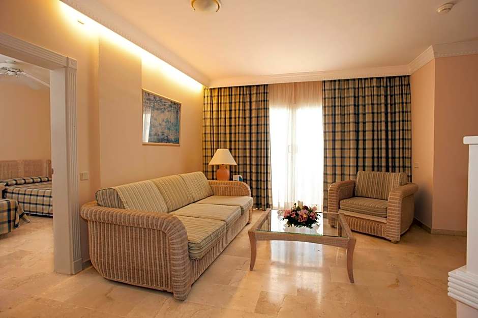 Evenings light up with free live music and performances, while families can enjoy a playground and free mini golf. On-site Restaurante #1 serves Spanish and International cuisines, complemented by a bar for easy drinks. Beach days are easy with umbrellas and chairs provided for free, and a waterslide adds a splash of extra fun to the stay.